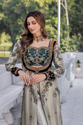Adorn yourself in a white slit-open dress adorned with exquisite copper embellishments. Teal velvet graces the neckline and sleeves hem, adding a touch of allure. Complete the ensemble with trousers featuring an embellished velvet hem embodying elegance.