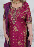 A bold, festive ensemble cut from korean raw silk in a striking magenta hue, intricately hand embellished with resham, zari, and sequins.