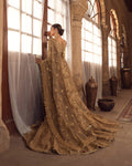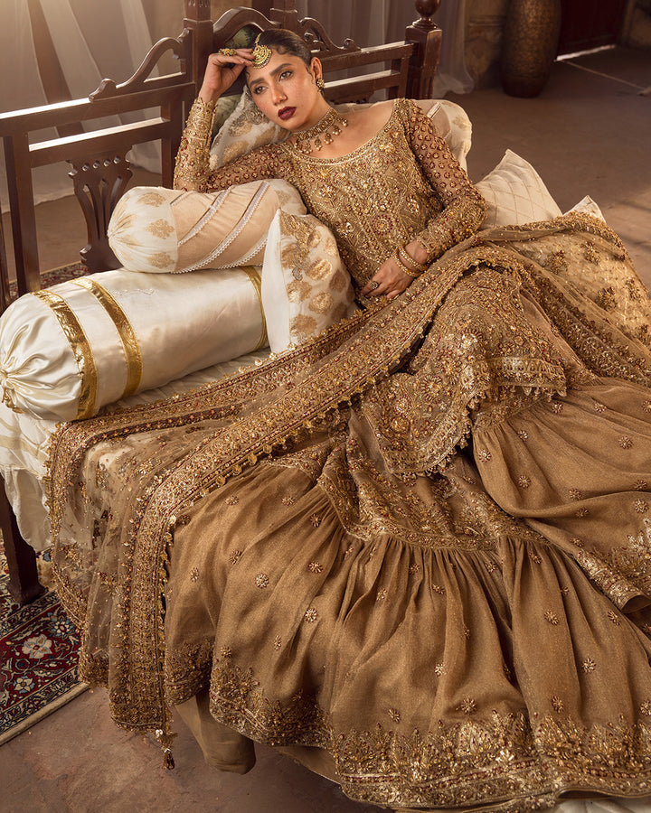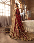 Description: Fashioned in a dainty khaadi net fabric, Naisha is an epitome of classic elegance. This set features a tessellated jaal of hand-cut sequins, dabka and naqshi layered with contrasting red blooming florals etched in resham and zardozi. Its richly detailed jaal is entwined with linear design accents wrought with cut dana and tilla that run through the length of the shirt. Paired with a gorgeously ornamented farshi gharara, gold dupatta adorned with an encrusted border all over and a contrasting red chaddar, Naisha is timeless in appeal.