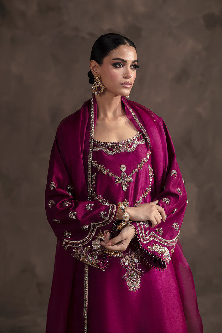 A classic burgundy shalwar kameez featuring wide open sleeves adds a touch of regal charm, while intricate floral trellises adorn the kameez front and back, shimmering with handcrafted gold, copper, and silver tone embellishments. Each stitch, delicately woven with cora, tilla, and dabka, tells a story of exquisite craftsmanship. To complete the look dyed organza dupatta comes along.