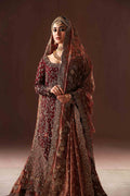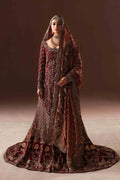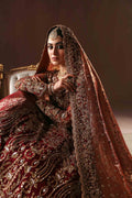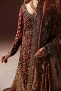 A stunning and timeless design for the bride who loves an antique gold aura with a beautiful and deep maroon pallette. A fully hand embellished shirt is covered with fine zardozi work with sequins and thread work. A two-legged, pure jamawar farshi gharara is covered with delicate vines and florals in tilla work and zarodozi with a touch of crystals. A fine silk tissue dupatta with a full scalloped border, and an addtional jaal on the head area completes this majestic bridal dress. Sure to be the perfect choice for the traditional bride.