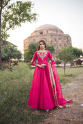 Hot pink raw silk maxi paired with organza dupatta. Antique gold embellishment over the