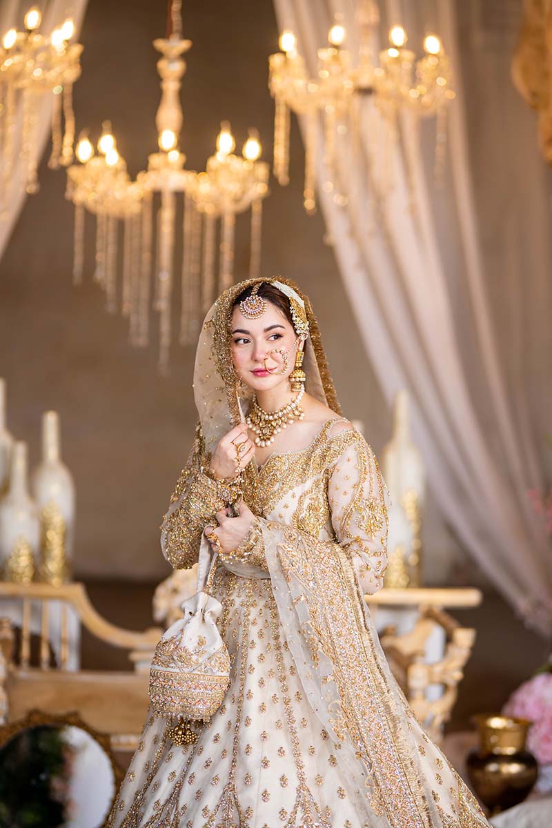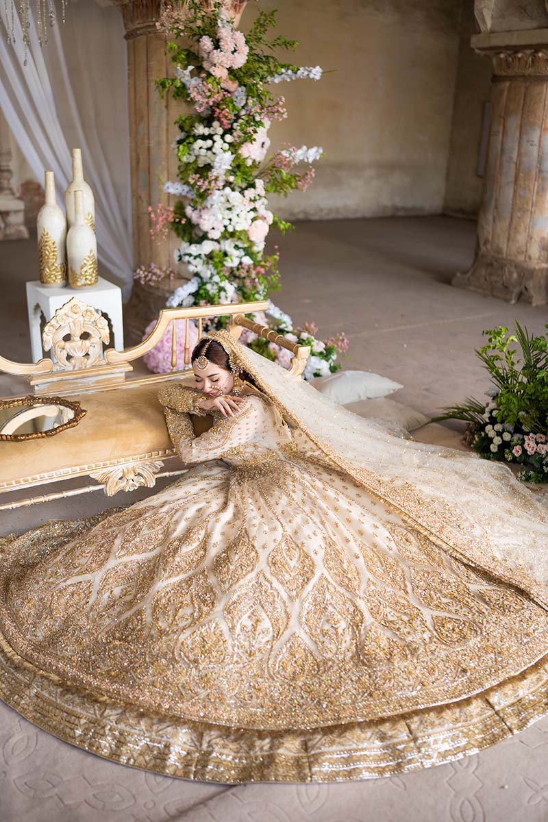 An offwhite organza pishwas and duppata paired with raw silk lehnga is heavily embellished with zarri, dabka, sequence and resham