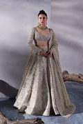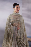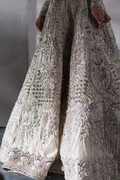 Meet Livia, a celestial vision in a neutral light hue presenting Soraya’s craftsmanship on tissue canvas. This bridal attire features an off-white attire adorned with delicate floral patterns in peaches, lilacs, and greens. Luxuriously woven with iridescent sequins and pearls, ‘Livia’ captivates with its regal charm.