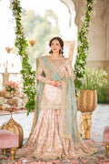 Pastel pink Raw Silk knee length Shirt and Sharara paired with pure organza dupatta is beautifully enhanced with mixed medium hand embellishments.