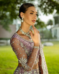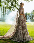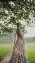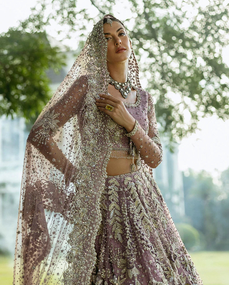 A stunning purple lehenga choli adorned with intricate dabka, naqshi, pearls, and Swarovski crystals, creating a radiant bridal look. The net lehenga features a delicate spray of thread and sequins, adding a soft shimmer to every step.