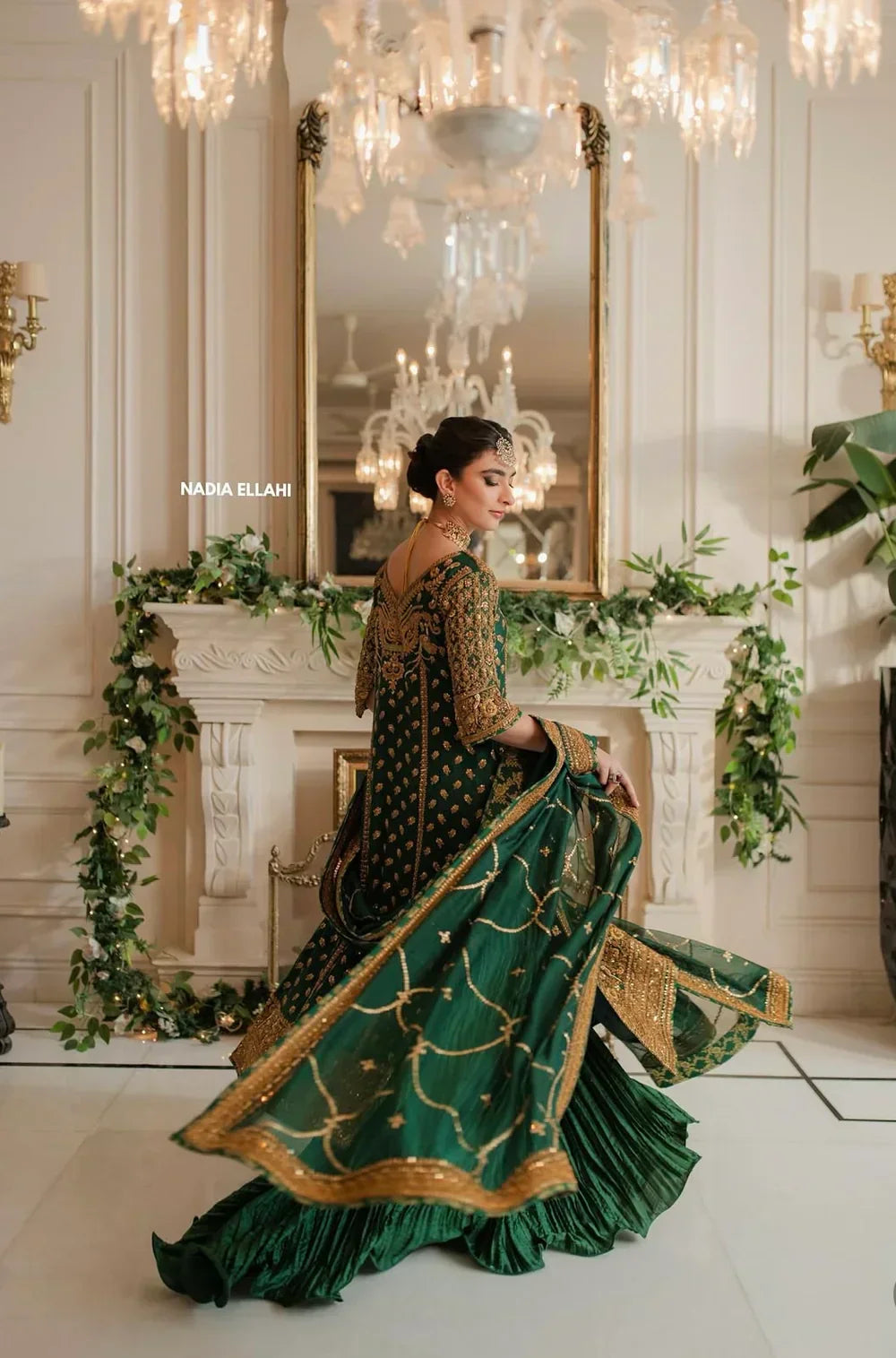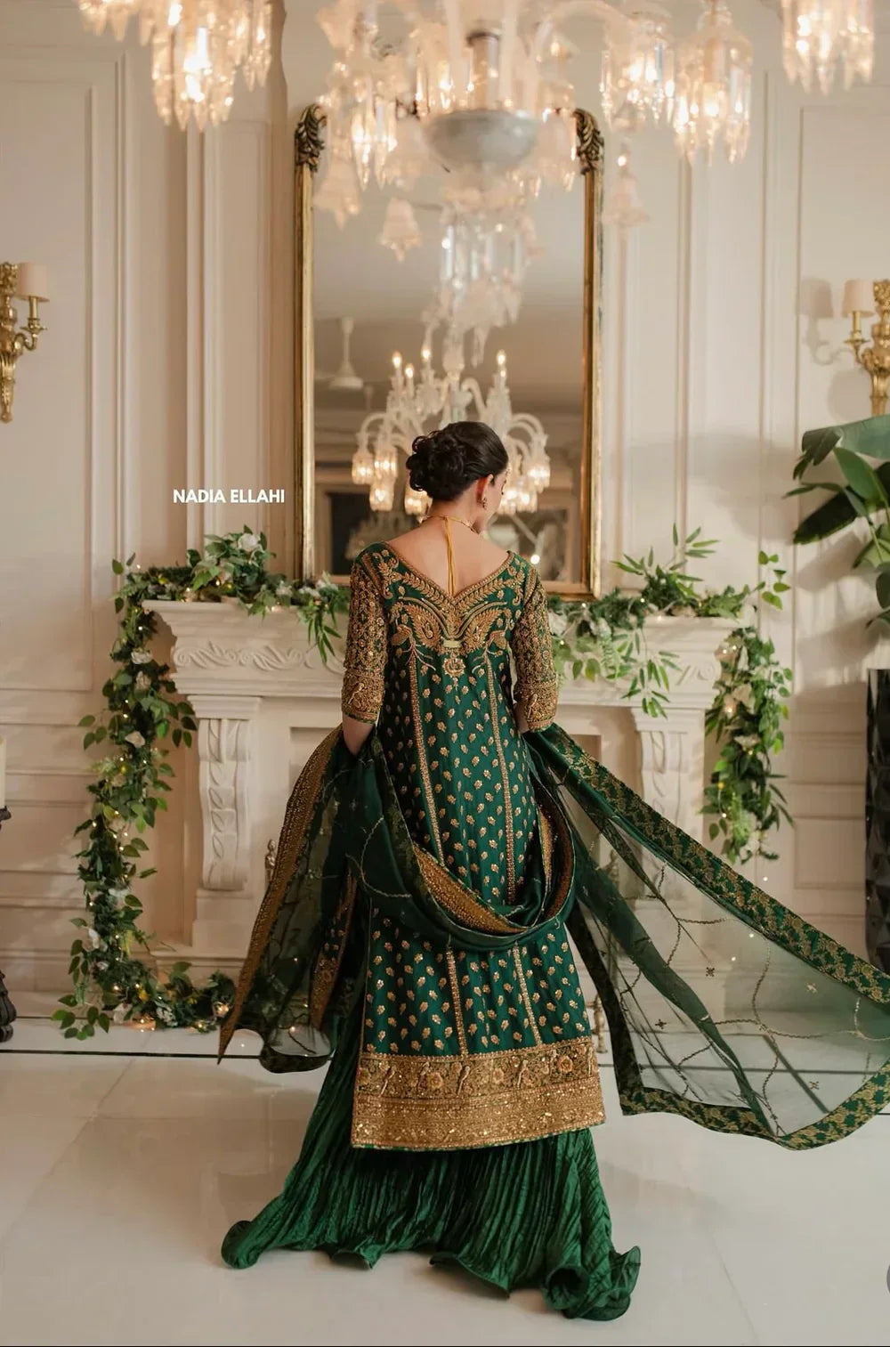 “Mehrunissa by Nadia Ellahi” is an opulent ensemble that embodies regal charm and timeless sophistication. Designed with meticulous attention to detail, it features exquisite hand embroidery, intricate embellishments, and luxurious fabrics that drape gracefully. The ensemble’s rich color palette and delicate craftsmanship reflect a perfect fusion of tradition and modern elegance, making it an ideal choice for those who seek refinement and grandeur.