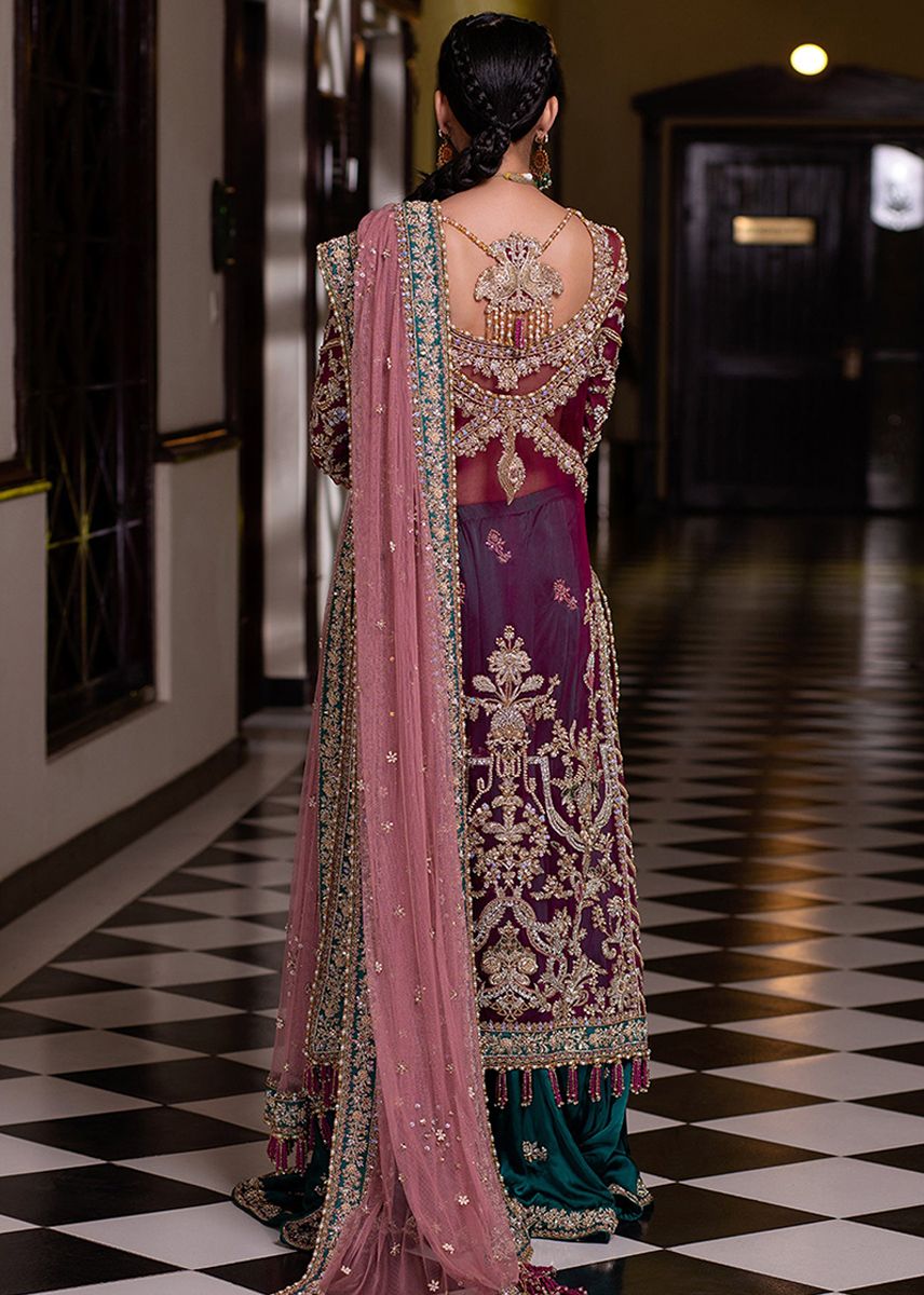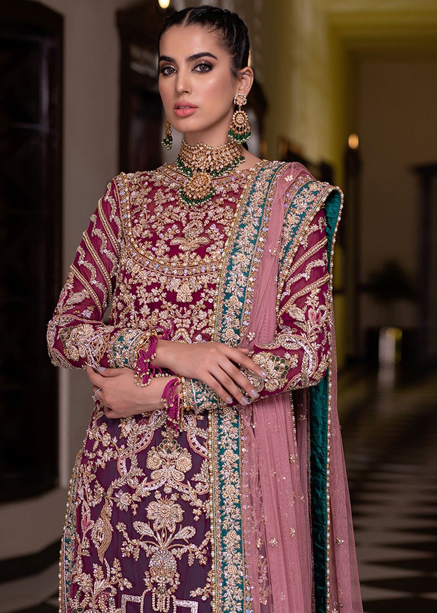 This elegant Magenta traditional Wear is an embellishment of full crafted embroidery to creatively decorate straight long shirt edged with bead tassels, Paired with aqua tone Sharara and a rose hue dupata with a sprawled ornamentation.