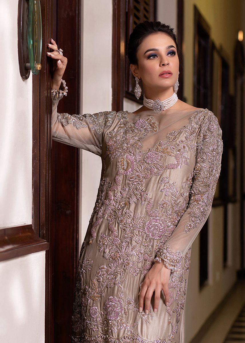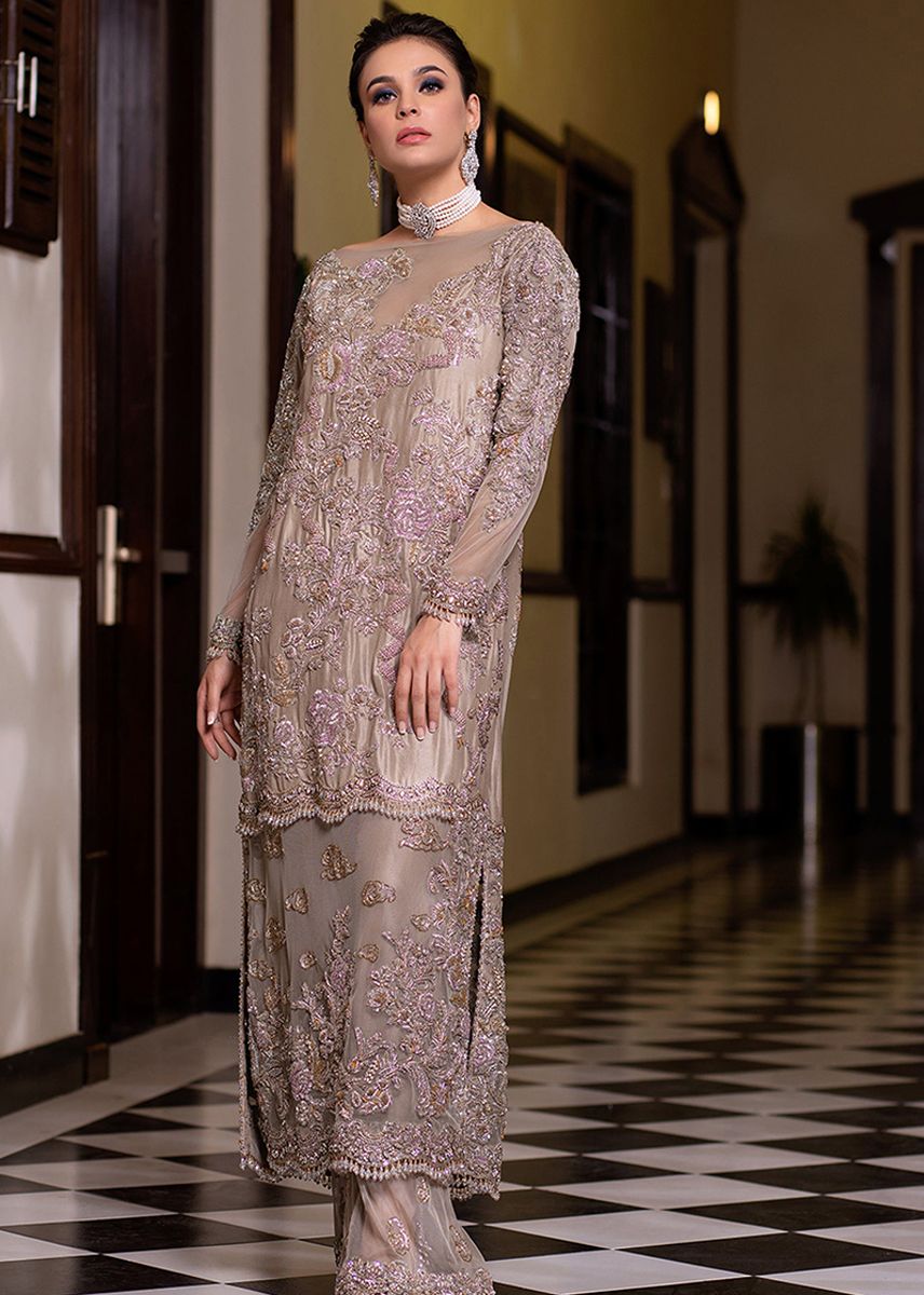 This Oat brown luminous dress is perfectly curated with a Tila floral work on net straight shirt and trouser. Designed with bead tassels well rounded on this exquisite apparel.
