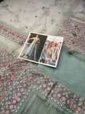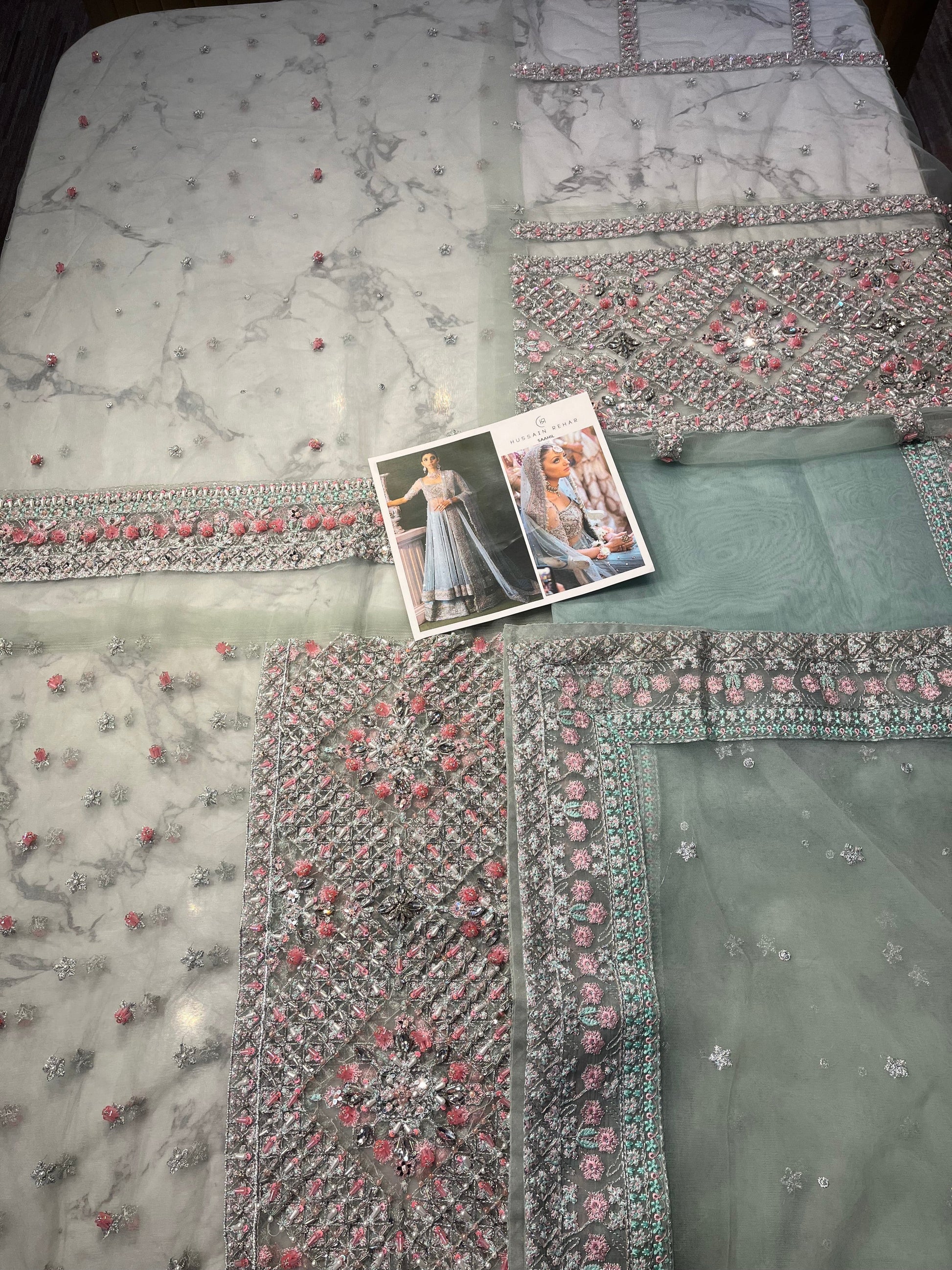 This ice blue net pishwas is gorgeously emberoided in hues of pinks and blues along with silver tilla. Adorned with pink and silver pipe work, mukesh, dabka, naqshi and stones.Completing the look with crushed silk sharara with heavy borders along with net dupatta featuring thick embellished four sided borders.