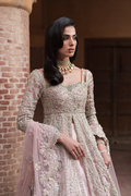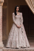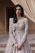 VIANA, a captivating dance of grace, showcases a blushy pink organza gown embellished with intricate handwork, blending green petals, mukesh, and dabka accents. The ensemble includes a net dupatta and a printed lehenga, creating a unique harmony of elegance. With a cutline silhouette that exudes refinement, Soraya Bridals presents a masterpiece in delicate fabric and jeweled accents, inspiring pure enchantment for the beholder.