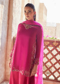 A striking shocking pink ensemble crafted from pure raw silk, adorned with intricate Ada handwork and precise machine embroidery along the sleeves, hemline (daaman), and neckline. The outfit is paired with Indian charmeuse fused flared sharara pants, adding movement and elegance, and is completed with a flowy medium organza dupatta featuring an all-over Ada spray embellishment, creating a vibrant and meticulously detailed look perfect for formal occasions.